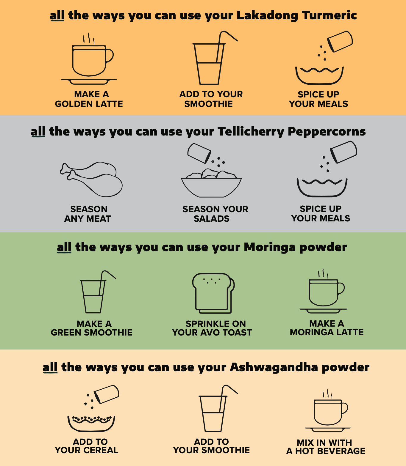 Our premium tasting box of spices sourced from the best single origin farms in India giving you the all round benefits of Immunity with our Lakadong Turmeric and the spicy goodness of Tellicherry Pepper which brings out the bioavailability of turmeric. Our Moringa powder gives you a boost of caffeine free energy while our Ashwagandha powder is an adaptogen that helps your body adapt to stress.